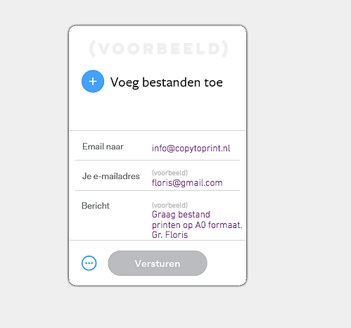 - Is het bestand groter dan 10 MB of wil je meerdere bestanden uploaden? Doe dit dan via de site wetransfer.com. Let op: vul in bij ‘e-mailadres ontvanger’ altijd in: info@copytoprint.nl
